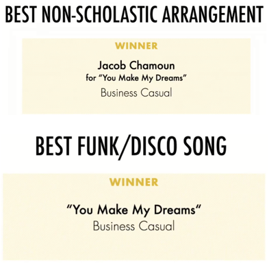 Holy guacamole - we are so grateful for this fabulous recognition from the Contemporary A Cappella Recording Awards! We won Best Funk/Disco Song and Best Non-Scholastic Arrangement for You Make My Dreams, as well as a runner-up title for our 2020 holiday album, Holiday Bonus! Congrats to all the nominees and winners!